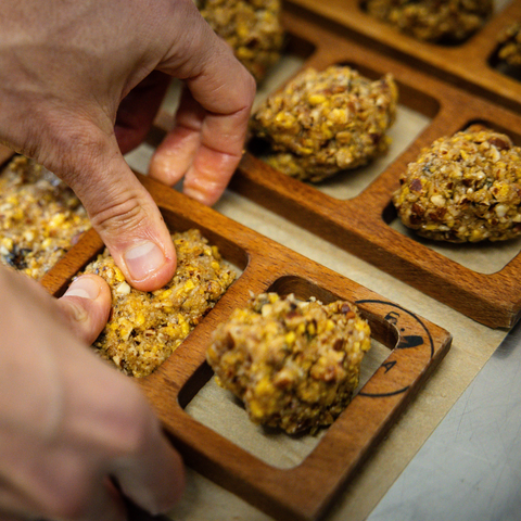 Tomate Piment Curcuma: Miel de lavande IGP (Abeilles de l’Estaque)*, sésame*, beurre de cacahuètes*, pétales de maïs*, tomate séchées*, curcuma confit*, piment confit*, thym*, sel de Camargue*.